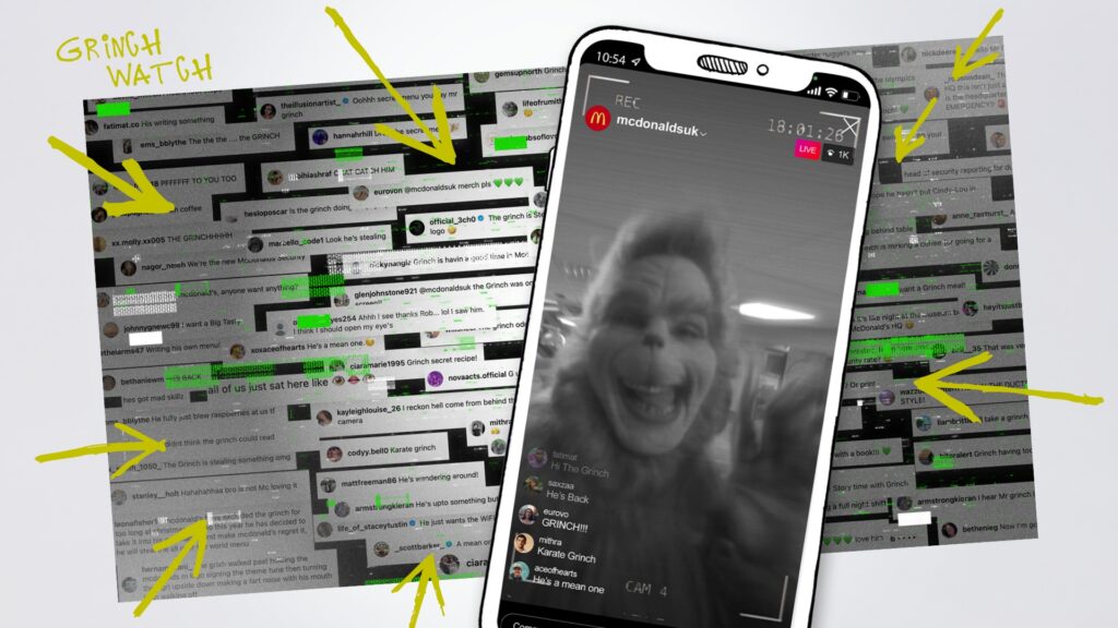 The tease phase of the campaign built anticipation across Organic Social, OOH and AV, showing a mysterious figure meddling with McDonald’s. First, the Grinch appeared surprisingly in a re-edited 30 second AV McDelivery spot on the 16th November during the ‘I’m A Celebrity’ launch show. This was followed by a special build revealing The Grinch’s ‘Master Plan’, annotated with playful illustrations of the Grinch’s plans and “Grinched” McDonald’s menu items.